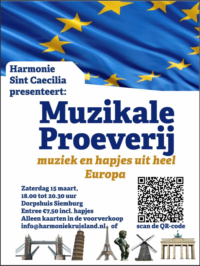 Op zaterdag 15 maart organiseert Harmonie Sint Caecilia het evenement ‘Muzikale Proeverij’. Vanaf 18.00 uur kunnen bezoekers genieten van een muzikale reis door Europa. Voor slechts EUR 7,50 krijg je niet alleen prachtige muziek voorgeschoteld, maar ook culinaire hapjes uit meer dan 10 verschillende Europese landen.