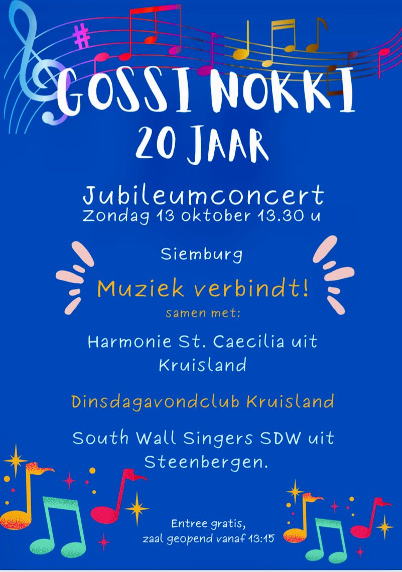 Graag willen wij Gossi Nokki feliciteren met hun 20 jarige bestaan, waarin ook onze Harmonie een rol mag spelen bij hun Jubileum concert.
